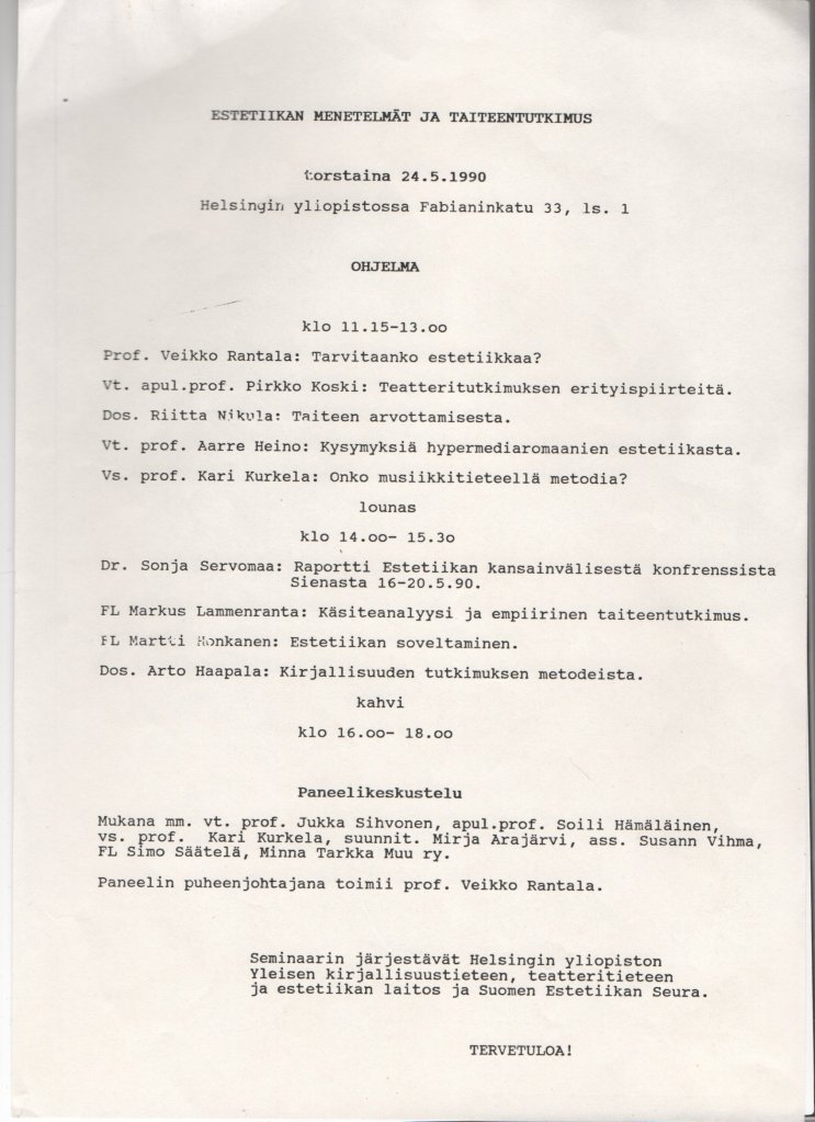 Runsas vuosi Helsingin yliopistoon tuloni jälkeen oma Yleisen kirjallisuustieteen, teatteritieteen ja estetiikan laitoksemme järjesti yhdessä Suomen Estetiikan Seuran kanssa seminaarin ”Estetiikan menetelmät ja taiteentutkimus”. Arkistostani löytyi sen ohjelma ja vaikuttava nimiluettelo, joka ei tosin kerro onko kysymyksessä osanottajien vai seminaarikutsun saaneiden lista. Olin liittänyt ohjelman yhteyteen oman esitelmätekstini ja sen muutamia työversioita.
