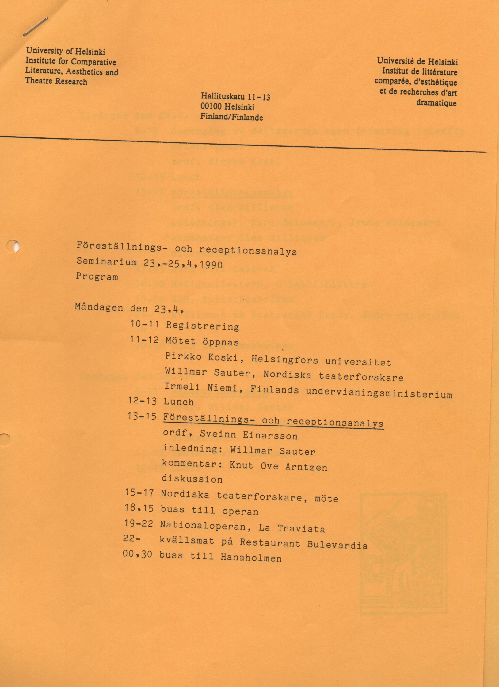 The Association of Nordic Theatre Scholars, Nordiska teaterforskare, was founded in Stockholm in 1989 and its first seminar was organised the following year, hosted by the University of Helsinki’s theatre studies department. The seminar’s name “Föreställnings- och receptionsanalys” (Performance and reception analysis) exemplifies that contemporary theatre researchers were paying particular attention to the theatrical event: analysing performance and exploring reception studies.