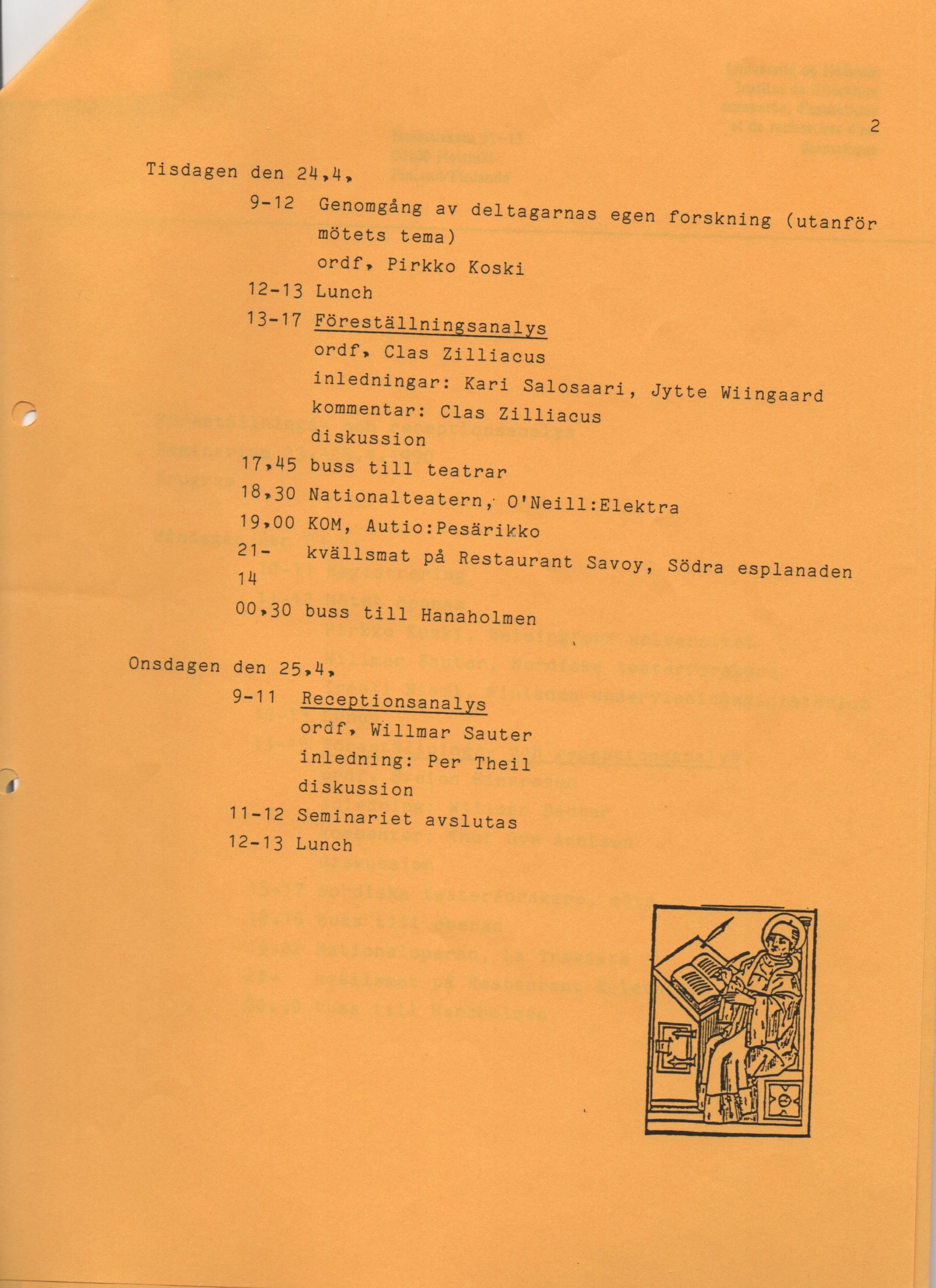 Kutsuihin perustuva luento-ohjelma nosti esiin tasapuolisesti alalla yleiset keskustelunaiheet ja pohjoismaiset teatterintutkijat. Keskimmäisen aamupäivän ohjelma, Genomgång av deltagarnas egen forskning, oli puolestaan painotetun kotimainen, rakentui avoimen kutsun perusteella eikä rajoittunut seminaarin teemaan. Arkistoni ohjelma ei paljasta jakson yksityiskohtia, mutta arvelen kolmen tunnin aikaan sisältyneen 5–6 oman tutkimuksen esittelyä, ja hämärän muistikuvani mukaan useimmat esittelyt liittyivät suomalaisiin tutkimuksiin. Pohjoismainen yhteisö muodosti ilmeisen tarpeellisen mahdollisuuden kotimaiseenkin vuorovaikutukseen, sillä suomalainen Teatterintutkimuksen seura perustettiin vasta myöhemmin ja kansainvälinen IFTR oli tässä vaiheessa vielä vain muutamien yliopistotutkijoiden tiedossa. Tämä selittää kiinnostuksen määrää suomalaisten keskuudessa.