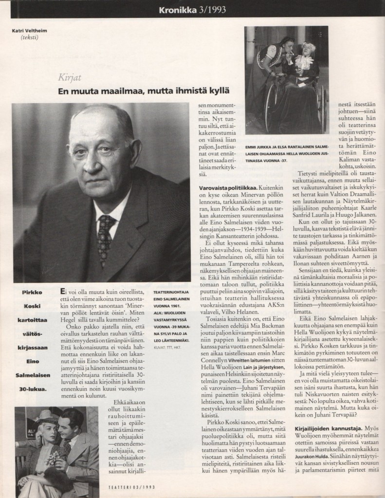 Tuohon aikaan tutkijan oli julkaistava työnsä kirjana ja prosessi oli monelle työläs ja joskus kalliskin. Tarjosin tekstiäni Otavalle, jonka kanssa olin ollut yhteistyössä Teatterimuseon aikana. Kustantaja ei pitänyt Eino Salmelaista kyllin myyvänä aiheena mutta kertoi mielellään ottavansa julkaistavaksi käsikirjoitukseni, jos kirjoitan väitöskirjassa runsaasti esiintyvästä Hella Wuolijoesta. Teinkin niin myöhemmin, mutta se ei ratkaissut ajankohtaista ongelmaa. Minulla ei ollut aikaa pidempiin etsimisiin, ja päädyin viemään käsikirjoituksen Yliopistopainoon. Maksoin kulut ja tein sopimuksen kirjan myymisestä. Yliopisto maksoi väittelijöille apurahan virallisesti luovutettavien kappaleiden vastineeksi, myyntikin sujui ja pääsin lopulta omilleni. 1990-luvun alussa kirjoja luettiin paljon ja lehdet kirjoittivat väitöskirjoista.