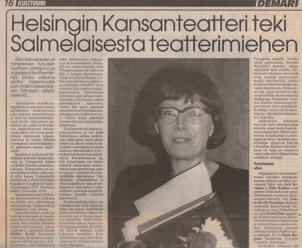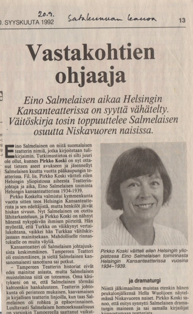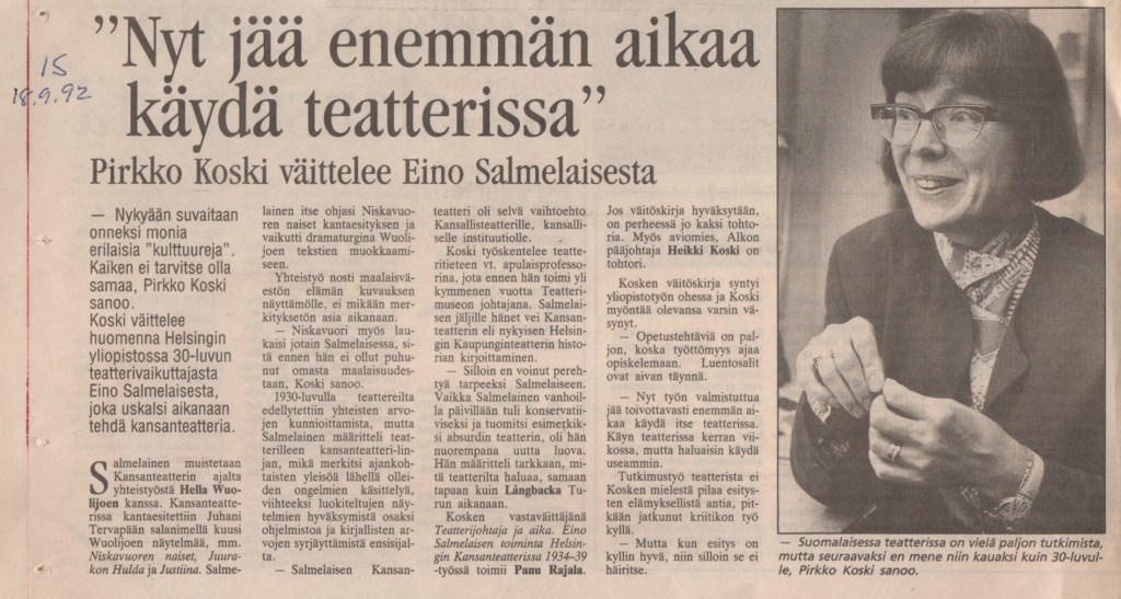 Suomalainen lehdistö oli vielä runsaslukuista, ja maaseutulehdetkin julkaisivat runsaasti kulttuuriuutisia. Arkistoa selatessani hämmästelen väitöskirjaani koskevien lehtijuttujen suurta määrää, vaikka kohteeni Eino Salmelainen oli ollut merkittävä teatterimies. Tohtorinväitöksiä oli vielä verrattain vähän, mutta myös kulttuuriosastoja ja vakinaisia kulttuuritoimittajia oli nykyistä enemmän. Sain hyvän arvosanan, mutta tutkimukseni ei ollut poikkeuksellisen loistava eikä sen saama huomiokaan luultavasti poikkeuksellista. Aikaa muistellessani päädyn kliseeltä vaikuttavaan ajatukseen, että tiedon kulussa ennen oli paremmin.