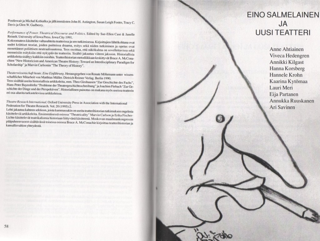 Kun tulin Helsingin yliopistoon, edellisenä syksynä teatteritieteen tutkintovaatimuksia oli tutkinnonuudistuksen yhteydessä jouduttu supistamaan erityisesti syventävien opintojen osalta. Jäljelle oli jäänyt typistetty valikoima, joka ei kuvastanut alalla tapahtunutta suurta kansainvälistä murrosta. Vieraskielinen kirjaluettelo oli helppo päivittää, mutta se ei korvannut suomenkielisen kirjallisuuden puutetta; molempia tarvittiin. Ryhtyminen käytännön opetustyöhön paljasti kirjavalikoiman puutteet ja ongelmat.
