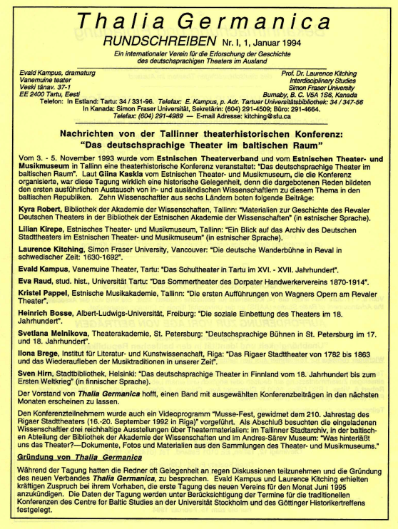 Nämä tapahtumat aktivoituivat arkistoa tutkiessani, kun ensimmäisenä vastaan tuli Kanadalaisen Simon Fraser -yliopiston professorin Laurence Kitchingin kirje (14. heinäkuuta 1995). Muistan lähettäjän vain hämärästi: muistikuvassa istumme pöydän ääressä keskustelemassa. Kirje kertoo enemmän. Kitching kiittää kesäkuun lopun vierailun kulinaristisista kokemuksista ja siitä, että olin auttanut hänet ulos Akateemisen kirjakaupan sokkeloista. Olimme nähtävästi Sven Hirnin kanssa löytäneet lisärahoitusta Thalia Germanican julkaisuun, joka sisälsi vuoden 1994 Helsingin ja vuoden 1993 Tallinnan kongressien tutkimusesittelyjä. Kitching oli myös anomassa rahaa Tallinnan Saksan Instituutin kongressiin syyskuussa, ja hakemuksen vahvistamiseksi olin lähettämässä kutsun kongressin jälkeiseen luentoon ja jatko-opiskelijoiden seminaariin Helsingissä.