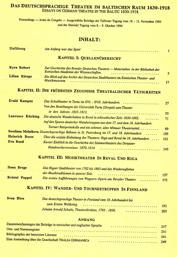 A researcher specialising in 19th century travelling theatre troupes and entertainment, Sven Hirn, helped our department participate in the activities of the Thalia Germanica network; we organised a few small-scale seminars that connected with our theatre history project and opened new avenues for exploring Baltic theatre research. Members of the network studied old German-language theatre troupes, and the network’s activities were characterised by archival research and iconography. Hirn’s book on touring theatre became part of our theatre studies syllabus, and Hirn’s knowledge of the archives was reflected in subsequent research on 19th century theatre companies touring the Nordic countries.
