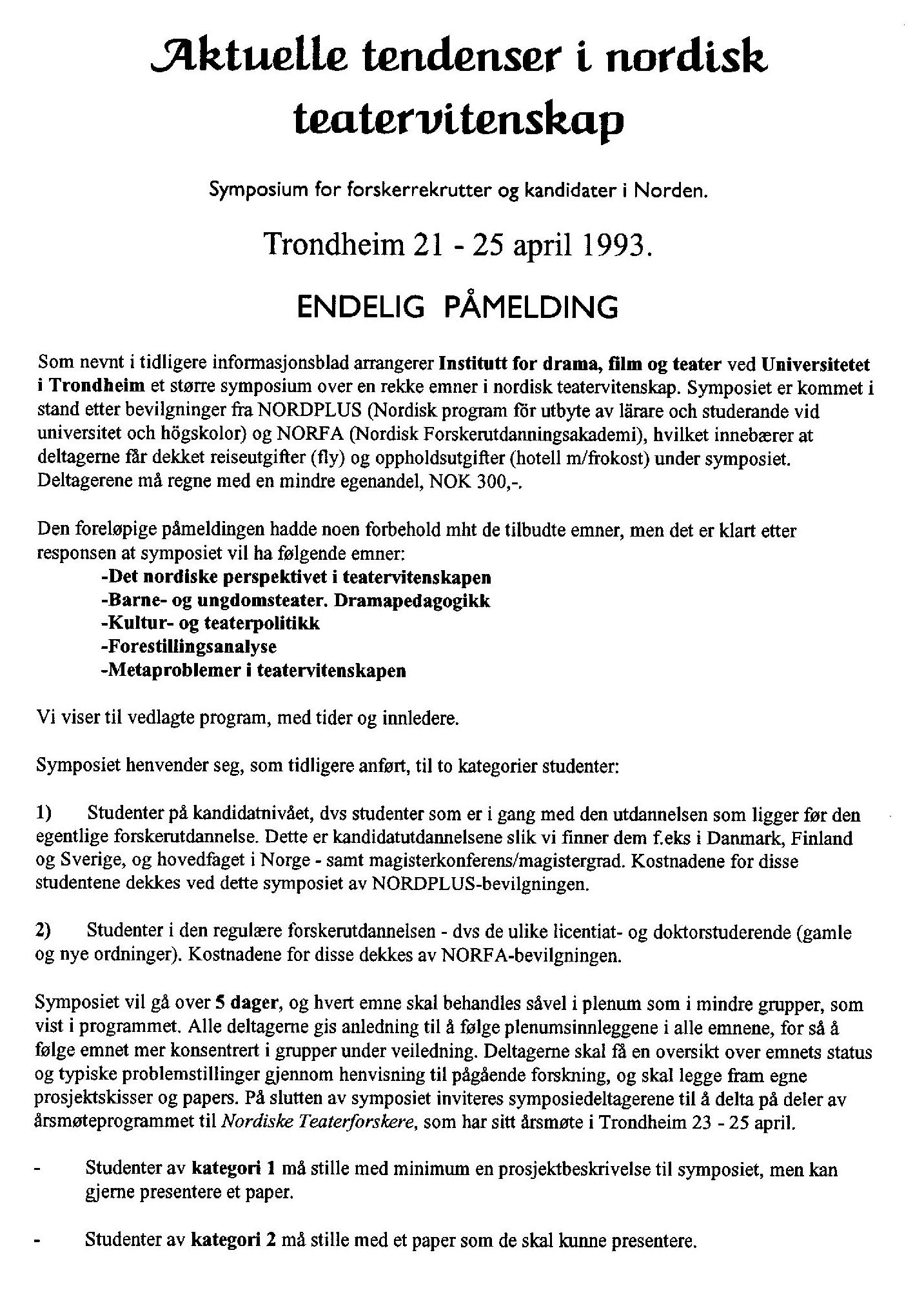 Aineisto sisältää myös laajan selvityksen ”Nordiske teaterforskarstuderande. Vilkor og visioner”, ja muistiinpanoni osoittavat pitäneeni kyselyä liian laveana. Pidin opiskelijoiden mielipiteiden selvittämistä hyvänä, mutta vaikka suomalaisiakin vastauksia oli ansiokkaasti mukana, esitettyjen kysymysten perusteella ei muodostunut käytännön toimintaa ohjaavia vastauksia. Esimerkiksi luettelo mahdollisista tutkimusteemoista sisälsi useita kymmeniä erilaisia ehdotuksia ja potentiaalisten luennoitsijoiden tai ohjaajien pitkä lista olisi rakentunut ilman kyselyäkin.