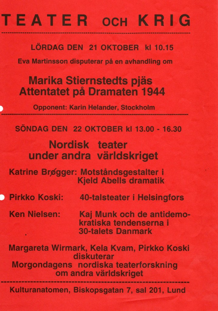 Pohjoismaisella rahoituksella toteutettujen hankkeiden rinnalla maiden kesken syntyi monenlaista satunnaisempaa yhteistyötä. Omalla laitoksellamme oli usean vuoden ajan ruotsalaisten ja tanskalaisten tutkijoiden kanssa vireillä suunnitelma Krig och teater, ja sen puitteissa järjestettiin muutamia seminaareja. Hanna Korsbergin kanssa vierailimme Kööpenhaminassa luennoimassa. Keväällä 2002 järjestimme Helsingissä pohjoismaisen seminaarin, jonka alustajina vierailivat Ken Nielsen ja Lisbeth Jørgensen Kööpenhaminasta ja Karin Helander Tukholmasta. Seminaarin suomalaisiin puhujiin kuului muiden muassa Pentti Paavolainen, joten myös Teatterikorkeakoulu oli edustettuna. Yhteys Tukholman yliopistoon oli läheinen ja toteutui yhtä lailla tutkijoiden ja opiskelijoiden tasolla.