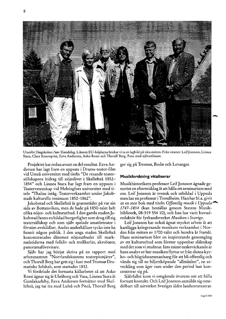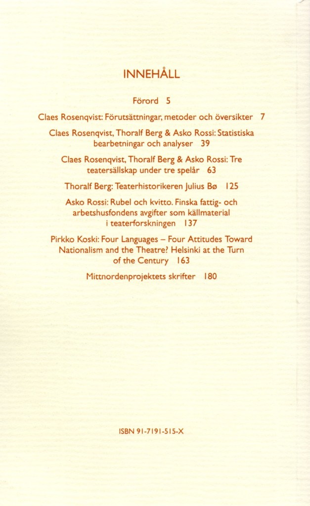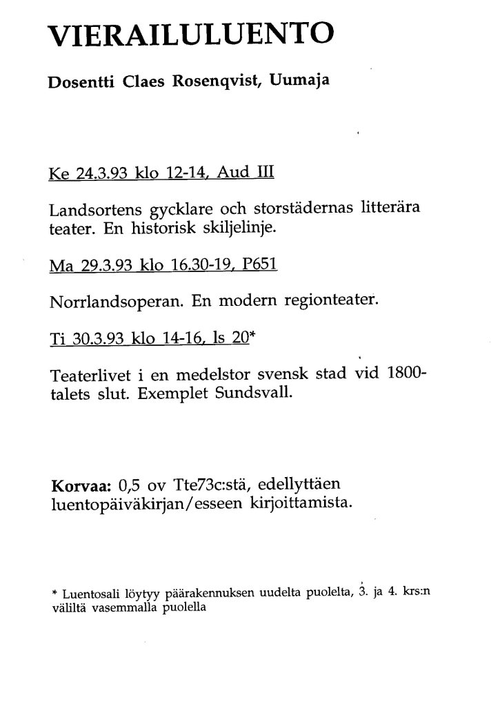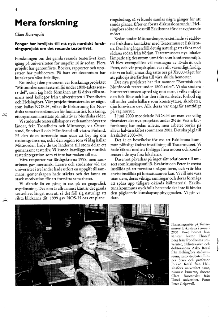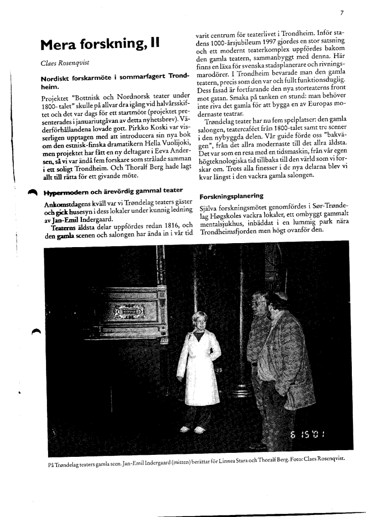 Projekti Mittnorden som teatermiljö under 1800-talets senare del puolestaan edusti hyvin käytännöllistä ja konkreettiseen tavoitteeseen pyrkinyttä hanketta. Sen rahoittaja oli Nordiska samarbetsnämnden för humanistiska forskning (NOS-H), ja toiminta alkoi vuonna 1994. Tavoitteena oli tutkia 1800-luvun viimeisen neljänneksen aikana Suomen, Ruotsin ja Norjan rajat ylittäneitä teatteriseurueita. Arkistoni kirjeenvaihto osoittaa, että olin kertonut hankkeen johtajalle, Uumajan yliopiston dosentille Claes Rosenqvistille opiskelijamme Asko Rossin kiinnostuksesta kiertueita koskevaa aihetta kohtaan ja arvioivani hänet päteväksi tutkimaan aihetta.