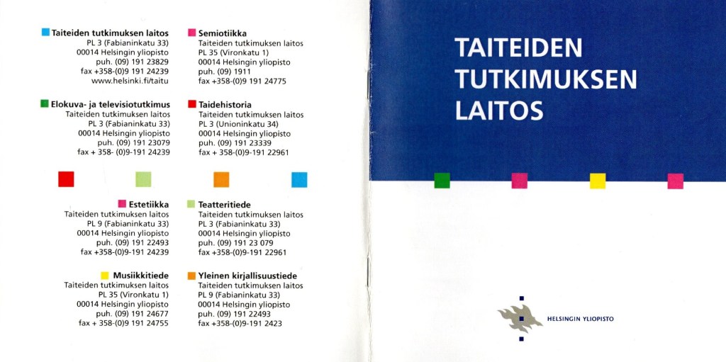 Laitoksemme uusi esite sisälsi aikaisempaan tapaan professori Hannu Riikosen historiakatsauksen, ja laitoksen johtajana toiminut professori Heta Pyrhönen tarkasteli toimintaa otsikolla ”Uutta kohti”. Hän kirjoitti taiteentutkimuksen laajentumisesta ja monipuolistumisesta sekä korosti taideaineiden tehtävää yhteiskunnan muutoksissa: ”Taiteiden tutkimuksen laitoksella on arvokasta opetettavaa: syventävä, huolellinen taiteen ’lukeminen’, joka on taiteenalojemme ytimessä. Sen kautta yksityinen taiteenkokija voi arvioida, miten teokset pyrkivät ohjailemaan hänen moraalisia, poliittisia ja esteettisiä arvojaan herättämällä hänessä samanaikaisesti esimerkiksi arvostelua ja vastarintaa, mutta myös ihailua ja nautintoa.” Hallinnollisten kehysten tavoite oli palvella olennaista sisältöä ja sen tavoitteiden toteuttamista.