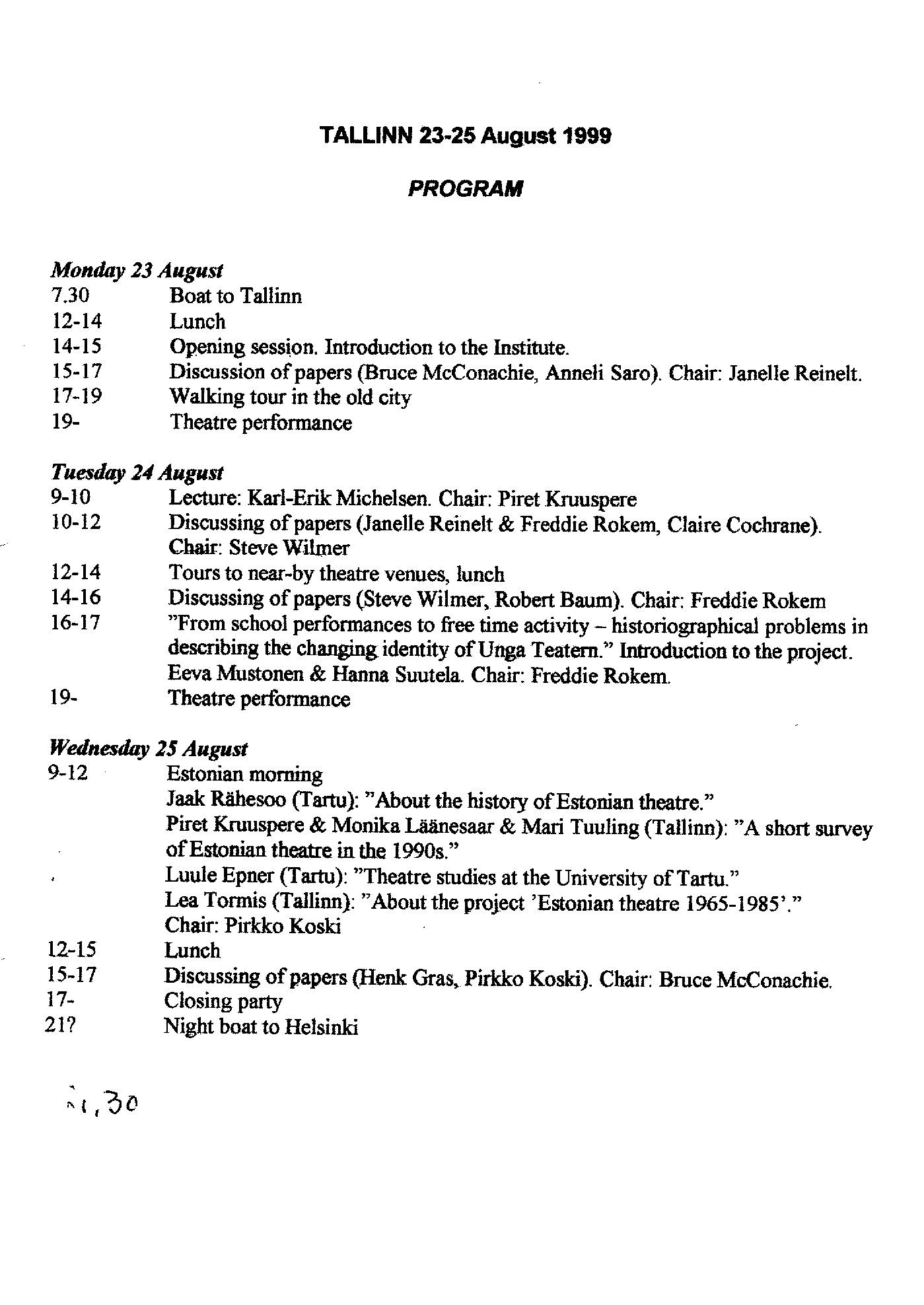 Teimme opiskelijoiden kanssa myös 1990-luvun loppupuolella lyhyen Tallinnan-vierailun, jolle osallistui sitä ennen Helsingissä luennoinut amerikkalainen professori Marvin Carlson. Tapahtumaa koskevat aineistot eivät ole tulleet vielä arkistossa vastaan, mutta käyntiin liittyy muutamia muistikuvia. Helsingissä Marvin Carlson kompastui kävellessämme Kansallisteatteriin, mistä löytyi ensiaputaitoinen asiantuntija ja tarpeiston kävelykeppi. Marvin sai kepin mukaan lähtiessämme Tallinnaan, ja se palautettiin lopulta Tukholmasta, minne hän jatkoi matkaa Tallinnasta. Omat opiskelijamme muistelivat matkan jälkeen, kuinka he olivat istuneet puistossa nurmikolla keskustelemassa kuuluisan teatterintutkijan kanssa, kun olin itse neuvottelussa virolaisten kollegojemme luona. Muistan myös, että kävimme Marvin Carlsonin kanssa Suomen lähetystössä nauttimassa tarjoilusta ja Vanhan kaupungin näköalasta.