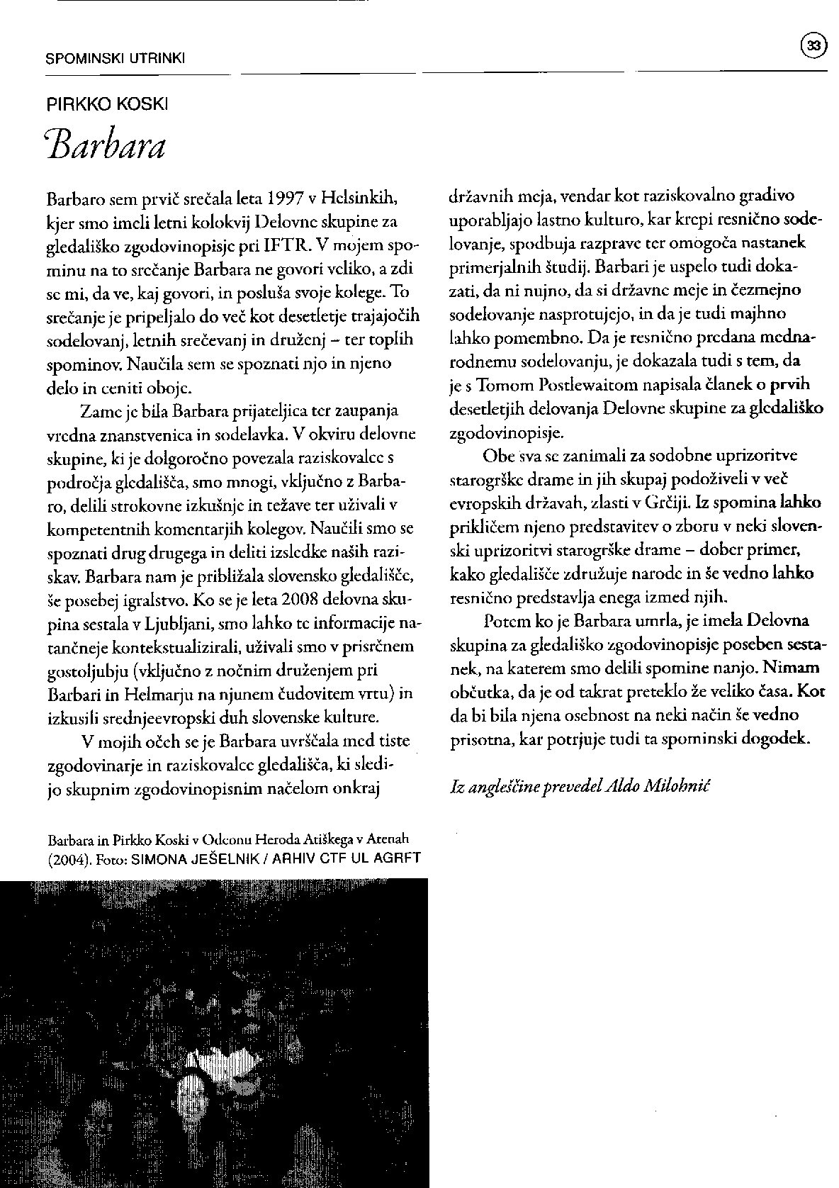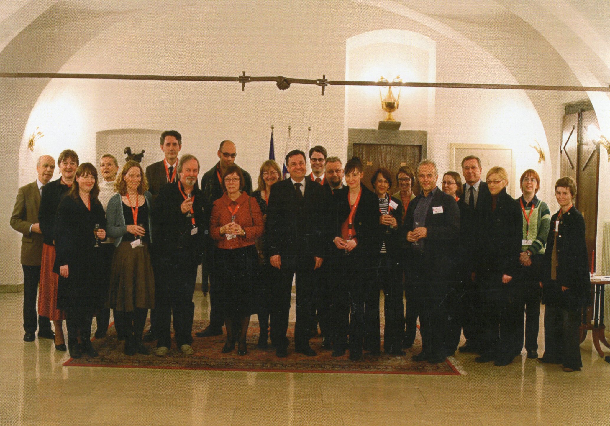 Teatterihistorian tutkijat asettuivat yhteiseen kuvaan Lyonin kongressissa pormestarin vastaanotolla. Ljubljanassa vastaanoton isännän ympärille kokoontuneessa historiografia-työryhmässä oli jo viisi suomalaista teatterintutkijaa. Jäsenten välille syntyi ystävyyssuhteita: kirjoitukseeni koordinaattorina toimineen Barbara Sušek Michielin muistokirjaan on liitetty kuva meistä kahdesta (ja miehestäni Heikistä) ateenalaisen teatteriesityksen katsomossa.