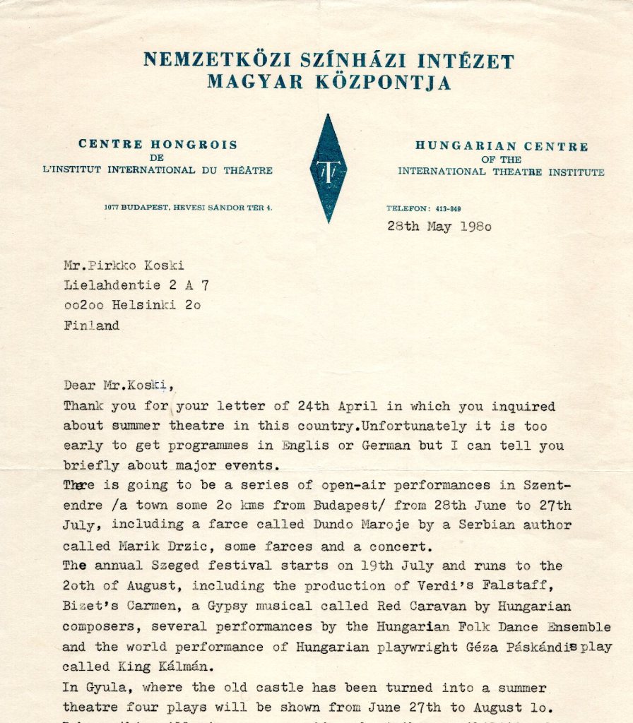 Vietin heinä-elokuussa 1980 kaksi viikkoa Unkarissa stipendiaattina perehtymässä maan teatteriin. Matka oli yhdistelmä virallista ja yksityistä, mutta teatteriyhteyksien määrä näyttää hyvin täyttäneen ITI:n asiantuntijavaihdon tavoitteet. Olin toiminut ITI:n toiminnasta vastanneessa Suomen Teatterijärjestöjen Keskusliitossa ensin ylimääräisenä työntekijänä ja sen jälkeen toiminnanjohtajan äitiyslomasijaisena ja aloittanut työn sivutoimisena päivälehtikriitikkona. Matkaraportin mukaan kävin myös arkistoissa. Olin siis lopullisesti siirtynyt teatterialalle.