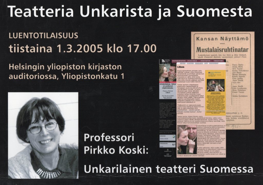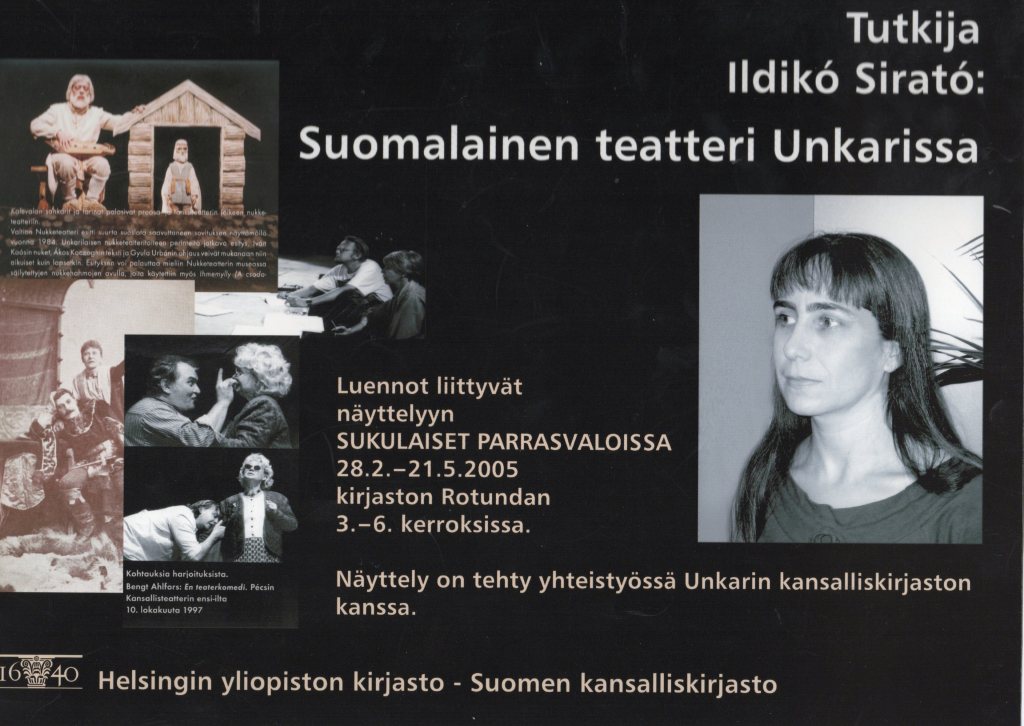 Kun se avattiin omassa Kansalliskirjastossamme, teatteritieteen opiskelijat kokosivat kanssani vitriininäyttelyn unkarilaisten näytelmien esityksistä suomalaisissa teattereissa. Näyttelyyn myös liittyivät luentomme Ildikón kanssa kirjaston auditoriossa aiheesta ”Teatteria Unkarista ja Suomesta”. Ildikó puhui suomalaisesta teatterista Unkarissa, minä unkarilaisesta teatterista Suomessa. Omille opiskelijoillemme sekä näyttely että luennot tuottivat opintopisteitä. Arkistossani on luentoni käsikirjoitus ja luettelo Suomessa esitetyistä unkarilaisista näytelmistä.