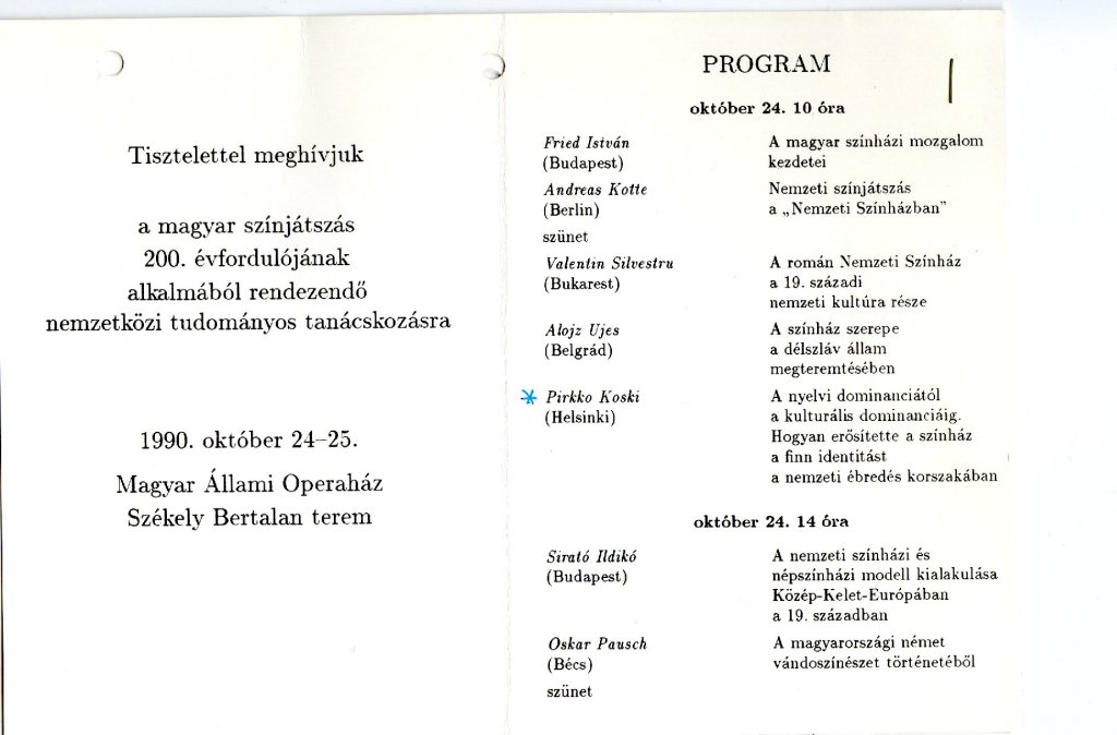 Unkarin teatteritaiteen 200-vuotisjuhlaa vietettiin vuonna 1990 ja sain luentokutsun sen merkeissä järjestettyyn kongressiin. Muut ulkomaiset luennoitsijat tulivat Unkarin naapurimaista sekä Saksasta ja Itävallasta. Muutamat heistä olivat tuttuja ennestään, ja pariin muuhun tutustuin kongressissa. Andreas Kotte Berliinistä ja Wolfgang Greisenecker Wienistä olivat olleet mukana yliopistolaitosten yhteisessä Erasmus-verkostossa, Oskar Pausch Wienistä oli tuttu Teatterimuseon ajalta SIBMASin puheenjohtajana. Unkarilaisista tutustuin Ildikó Siratóon ja Tamás Bécsyyn, jotka vierailivat myöhemmin Helsingissä. Suomea ja draamaa opiskellut Ildikó solmi seuraavina vuosina pysyviä yhteyksiä Suomeen ja yliopistoomme.