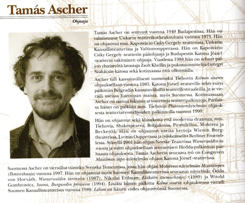 Unkarilainen teatteri ja erityisesti Katona József -teatterin kolme nimekästä ohjaajaa solmivat 1980-luvun kuluessa monia yhteyksiä Suomeen. Esimerkiksi Gábor Zsámbéki vieraili Helsingin Kaupunginteatterissa yhtenä Tšehov-sarjan ohjaajista ja Tamás Ascher ohjasi eri teattereissa useampiakin näytelmiä. Hänen Euroopassa mainetta saanut ohjauksensa Kolme sisarta nähtiin Suomen Kansallisteatterissa vuonna 1989, ja sen yhteydessä hän ja Katona-teatterin johtaja Gábor Zsámbéki vierailivat teatteritieteen luennollani yliopistolla. Muistan yhden opiskelijakysymyksen ja Zsámbékin aikaa kuvaavan vastauksen: kysymys kuului ”oliko Irina raskaana?” ja vastaus oli ensin lyhyesti ”ei”, mutta Zsámbéki halusi vähän mietittyään täydentää – ”Irina ei ollut eikä tule raskaaksi, kukaan sisarista ei ole eikä koskaan tule raskaaksi”. Vastaus kuvastaa ajan ja erityisesti Itä-Euroopan teatterin metaforia hyödyntävää tulkintatapaa.