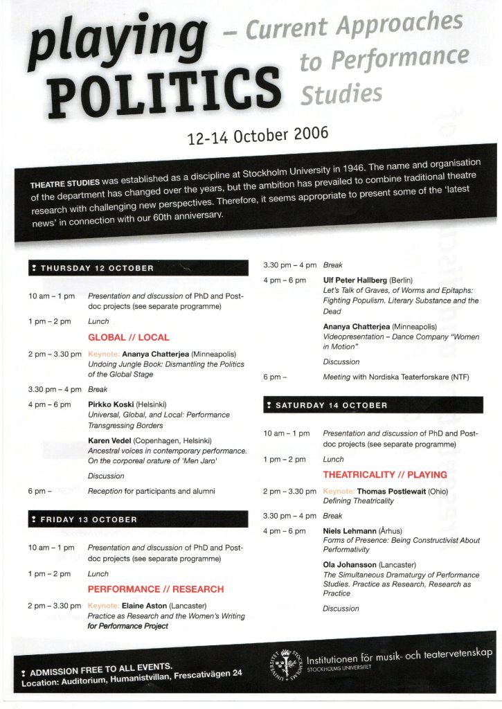 Huomaan osallistuneeni IFTR:n kongressiin lähes vuosittain ja ainakin kerran kaikissa maanosissa, mikä on luonnollista siksikin, että olin lähes koko professorikauteni ajan järjestön hallituksessa. Virkavuosinani väliin jäi vain yksi Intiassa pidetty kongressi. Eläkkeelle siirryttyänikin olin koronavuosiin saakka mukana melko säännöllisesti, sillä omat tutkimusintressini kotimaisista aiheista huolimatta edellyttivät laajempaa alan tutkimuskentän tuntemusta. Samasta syystä osallistuin virkavuosina usein amerikkalaisen järjestön American Society for Theatre Research (ASTR) syksyisin pidettävään kongressiin, jonka ohjelma oli tiivis ja mahdollisti muutamassa päivässä tutkimusalan tilanteen päivittämisen.