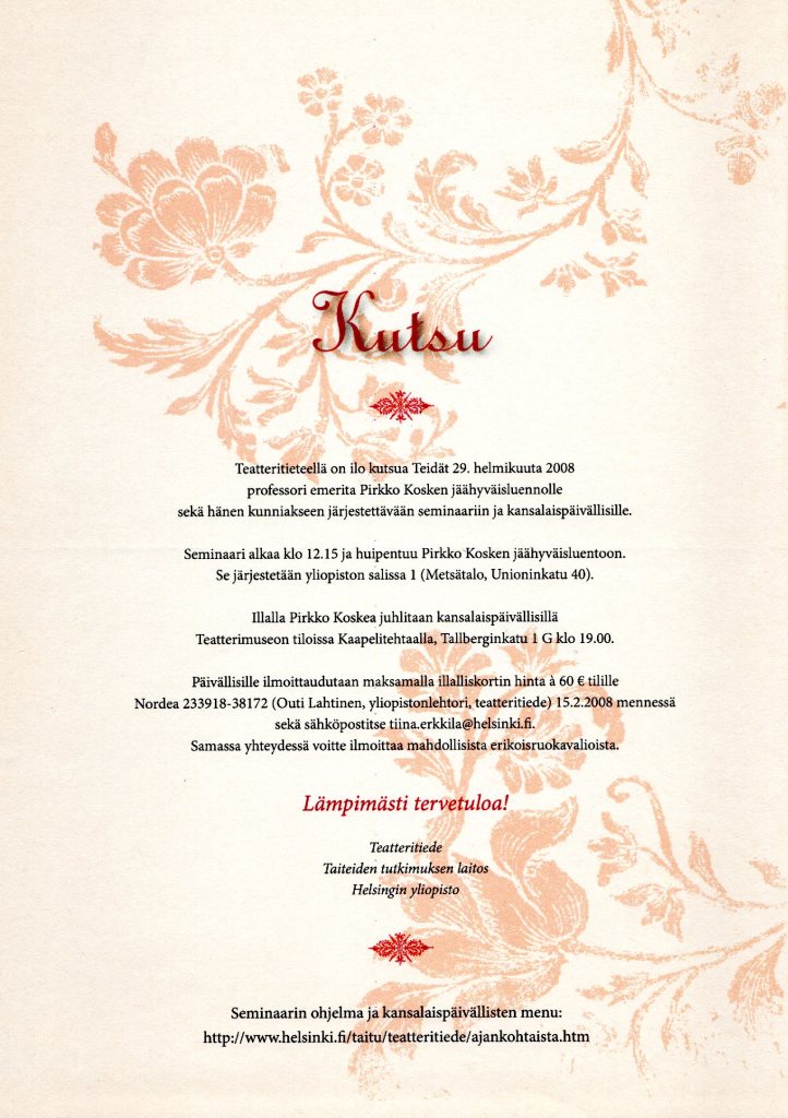 Aloitin uuden vuoden 2008 eläkeläisenä, ”täysinpalvelleena” professorina, joka sai päättää itsenäisesti tulevien vuosien ajankäytöstä. Muutama asia oli vähän kesken ja jäi vielä osittain vastuulleni, enkä oppinut heti sanomaan ei asioihin, jotka joku toinenkin saattoi hoitaa. Ensimmäisten vuosien aikana tuskin huomasin työn vähentyneen, mutta painopisteet olivat muuttuneet ja etääntyneet viranhoidosta. Havaitsin nopeasti, että teatteritieteessä oli kasvanut uusi pätevä joukko, joka vastasi oppiaineen etenemisestä mutta myös monista kulttuurialan tärkeistä toimista. Itse olin siirtynyt niihin omiin tehtäviini, joihin virkavuosina oli jäänyt liian vähän aikaa.