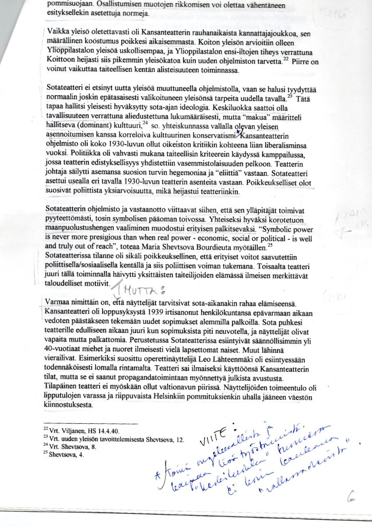 Arkiston artikkeliluonnoksesta puuttuu lähdeluettelo, mutta liitteenä on lyhyt kirjalista ja viitteissä mainitaan tarkat sijainnit. Mainitsen listassa omat Helsingin Kansanteatteria ja Eino Salmelaista koskevat tutkimukseni, Salmelaisen muistelmakirjan Hurma ja surma. Muistelmia tavallaan (Helsinki: Tammi 1957), tekstissä mainitun Bourdieun teoksen ja Maria Shevtsovan teoksen Theatre and Cultural Interaction. Listassa on Janelle Reineltin nimi, mutta en tiedä mikä hänen tutkimuksistaan on ollut mielessäni. Alaviitteissä viitataan arkistokoosteessa kopioina oleviin lehtikirjoituksiin sekä arkistoaineistoon, johon olin perehtynyt omien alkuperäisiin perustuneiden tutkimusteni kautta. Luonnostekstistä tunnistan Bourdieun lisäksi taustavaikuttajina muitakin 1990-luvulla teatterintutkijoiden piirissä vaikuttaneita tutkimuksia. Käytetyistä ilmaisuista ja sanavalinnoista päättelen, että esimerkiksi Raymond Williamsin tekstit olivat kuuluneet lukemistooni, ja kommenteissani on maininta ”korkeasta” ja ”matalasta” taiteesta, mikä muistikuvissani liittyy kesäkoulun keskusteluihin.