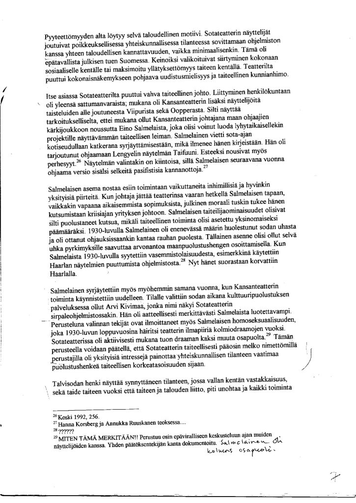 Vastaus artikkeliluonnoksen alussa esitettyyn kysymykseen ”miksi teatteri taipui ulkopuoliseen määräysvaltaan?” näyttää melko odotetulta. Tapahtuman analyysi valituissa kehyksissä jäsensi tarkastelua tuottamatta yllättäviä tuloksia. Todennäköisesti tästä syystä en katsonut välttämättömäksi tekstin kehittelyä julkaistavaksi artikkeliksi. Tapahtuma itsenäisenä kohteena myös näyttää riittämättömältä erillisen tutkimuksen aineistoksi. Voin kuitenkin nähdä artikkeliluonnoksen hyödyllisenä opetusmateriaalina, kun tarkastellaan ryhmänä teatterihistorian tutkimisen menetelmällisiä ja teoreettisia suuntauksia. Se voi myös antaa joitakin viitteitä laajempiin tutkimuksiin, kuten omaan Helsingin Kansanteatterin tai Eino Salmelaisen vaiheita koskeviin projekteihin tai sota-ajan esitystoimintaa analysoiviin laajempiin hankkeisiin. Niistä tällä hetkellä ajankohtaisin on FT Aino Kukkosen rintamateattereita koskeva projekti.