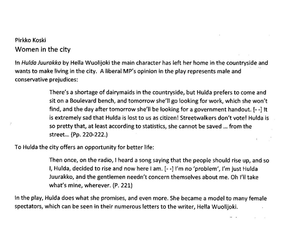 Käsikirjoituksissa kirjeet olivat aluksi tukemassa näytelmäanalyysiä ja yhteiskunnallista kontekstia koskevia johtopäätöksiä. Ensimmäinen käsikirjoitus ”Women in the City” ja siitä laajentunut teksti alkoivat sitaatilla Juurakon Huldasta, mikä nosti keskeiseksi näkökulmaksi kaupungin ja maaseudun välisen jännitteen. Otsikosta huolimatta käsikirjoituksissa oli osin rinnan suomea ja englantia osoittamassa että olin käyttänyt kääntäjää. Juurakon Huldan rinnalla tarkastelin näytelmää Niskavuoren naiset. Näiden kahden rinnastaminen liittyi kysymykseen ”vaarallisesta naisesta”: näytelmässä Niskavuoren naiset vapaamielinen kaupunki tuli maaseudulle synnyttämään pahennusta, kun Juurakon Hulda osoitti terveen maaseudun hengen voittavan kaupungin vaarat. Tarkastelin yleisöä myös populaarin taiteen hengessä. Tunnistan taustalla kaksi tutkijayhteisöä: kulttuurintutkimukseen liittyvä painotus ja otsikko viittaavat kaupunkitutkimusprojektiin, englanninkielisyys ja työryhmän jäsenten kirjoitusten mainitseminen lähdeluettelossa puolestaan IFTR:n Historiography-työryhmään.