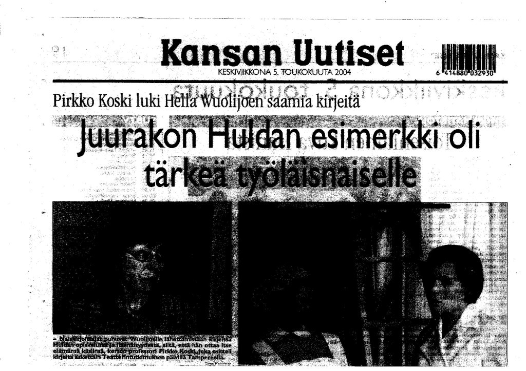 Arkistossani on toukokuulta 2004 Kansan Uutisten lehtikirjoitus, jossa kerrotaan minun tutkivan Hella Wuolijoen saamia kirjeitä. Kirjoitus on otsikoitu ”Juurakon Huldan esimerkki oli tärkeä työläisnaiselle”, mikä kuvaa yhden kirjeen sisältöä ja julkaisseen lehden linjaakin mutta vastaa hyvin arkistossani säilyneiden lukuisien naiskatsojien kirjeitä koskevien käsikirjoitusten henkeä. Puhuin aiheesta Teatterintutkimuksen seuran TeaTS:n kevätseminaarissa ja muistelen, että jutun kirjoittaja Sirpa Koskinen oli mukana seminaarissa eikä lehtikirjoitus perustunut haastatteluun. Tutkimusesittely liittyy pitkäaikaiseen kiinnostukseni aihepiiriin, jossa yhdistyvät populaari taide, yleisökokemukset, sosiaalinen ympäristö ja monipuolinen kohde Hella Wuolijoki. Arkistossani on useita tähän liittyviä käsikirjoituksia. Kirjeissä Wuolijoen näytelmien katsojat kertovat teatterikokemuksistaan.