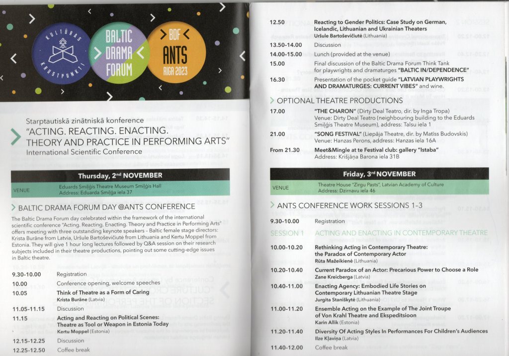 Marraskuun alussa Pohjoismaiden ja Baltian maiden teatterintutkijoiden Association of Nordic Theatre Scholars (ANTS) järjesti vuosittaisen kongressinsa Riikassa Latviassa. Siihen liittyi päivän seminaari Baltic Drama Forum, johon tutkijakongressin tapaan osallistui myös suomalaisia. Olin 1990-luvun taitteessa perustamassa järjestöä ja puhuin Riikan esitelmässäni tuona aikana kaikkialla suurten muutosten keskellä olleen teatteritieteen asemasta Suomessa. Luonnollisesti esiin myös nousi teatterintutkimuksen asema tänään.